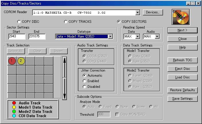 - Next >をおし、セーブしたいパス名をImage Fileに書き込み、(TRACK?.BIN等がいいでしょう)Finishボタンを押せば、HDに吸い上げれます。