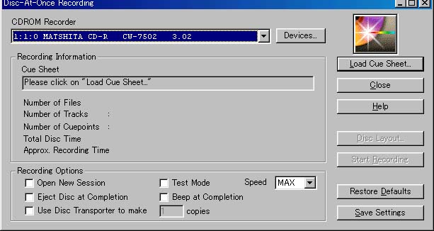 - Load Cue Sheetを押し、STEP3で作ったCUEシートを読み込む。